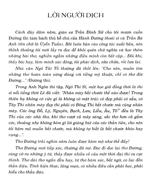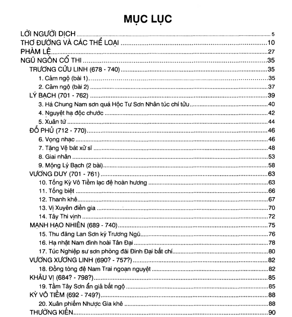 Thơ Đường là một hiện tượng thi ca đặc biệt được cả nền và đỉnh. Kéo dài suốt từ thời nhà Đường, từ khi Đường Cao Tổ Lý Uyên dựng triều đại, cho đến khi nhà Đường mất, ròng rã ba trăm năm (618 – 907). Số lượng có tới hàng vạn bài thơ của khoảng hai nghìn ba trăm nhà thơ… Cái nền vĩ đại ấy, lại có những thi hào nổi danh trở thành những danh nhân thế giới như Lý Bạch, Đỗ Phủ, Bạch Cư Dị… Một phong trào thơ, mở đầu và phát triển, luôn luôn có những tên tuổi mới, vượt trội lên. Phong cách của những nhà thơ nổi tiếng của đời Đường rất đa dạng: Mạnh Hạo Nhiên, Vương Duy, Trần Tử Ngang, Cao Thích, Lý Thương Ẩn, Trương Tịch… Thơ của họ đã rất khác nhau, nói chi đến Lý Bạch và Đỗ Phủ. Đề tài thể hiện từ những sinh hoạt xa hoa quy tộc, đến cảnh nghèo túng nhất của dân chúng, cảnh đời, cảnh tiên, cảnh thiền, núi non, sông nước, trận mạc, biên tái, hoa cỏ, rất phong phú: ở tài thơ này với tài thơ khác, một đề tài lại có vẻ đẹp chung, những phong vị riêng.