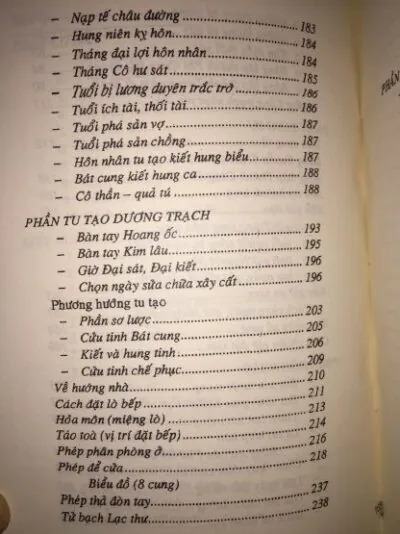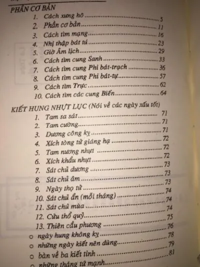 Trong 330 trang đầu, sách trình bày những kiến thức về xem ngày tốt xấu, xem tang sự, xem hôn nhân, tu tạo dương trạch, và xem sao chiếu mệnh. 292 trang tiếp theo lại bao gồm các chủ đề cụ thể hơn: xem nghề nghiệp, phép chọn người xuất gia, lữ tài hiệp hôn, ảnh hưởng tốt xấu của sao hạn, thước đo Lỗ Ban, trận đồ Bát Quái,…