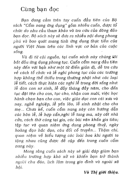 Và đi từ cội nguồn, tại cuốn sách này tác giả bắt đầu ứng dụng phong tục. Cuốn cẩm nang đầu tiên này đến với bạn đọc như một từ điển giản dị, dễ tra cứu về cách tổ chức và lễ nghi phong tục của các trường hợp không thể thiếu trong thường nhật như: các loại lễ tiết, cách thực hiện các nghi lễ trong đời sống như: lễ đón con sơ sinh, tục cho nhận con nuôi, việc học hành chọn bạn cho con, việc giáo dục con cái xưa và nay, nghề nghiệp, lễ yến lão, lễ sinh nhật cho cha mẹ…. Chưa kể, cuốn cẩm nang này còn hướng dẫn các hôn lễ, lễ hợp cẩn, nghi lễ tang ma, xây cất nhà cửa, cách thờ cúng tại gia, các bài văn khấn gia tiên, tập tục và quan niệm ứng dụng phong thuỷ, ngày hoàng đạo hắc đạo, câu đối cổ truyền…. Thậm chí quan niệm về biểu tượng các loài hoa khi người ta tặng nhau cũng được đề cập đến trong cuốn cẩm nang này.