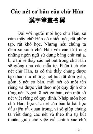 Phân tích các nét chữ Hán, ta có thể thấy chúng được tạo thành từ những nét bút rất đơn giả, gồm 8 nét cơ ban, mỗi nét có một tên riêng có quy định. Nhập môn học chữ Hán, học các nét căn bản là bài học đầu tiên rất quan trọng, vì sẽ giúp chúng ta viết đúng các nét và theo thứ tự bút thuận, giúp cho việc viết chính xác chữ Hán, và đếm chính xác số lượng nét viết của một chữ và từ đó giúp việc tra cứu từ điển chính xác và nhanh chóng hơn.