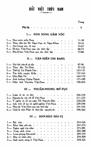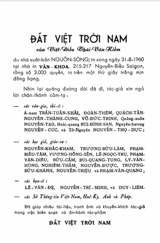 Bạn cùng tôi hôm nay sẽ thông cảm trên lập trường đó và chúng ta rất lấy làm hãnh diện là con dân một nước có một nền văn hiến cổ kính, một dân tộc đã từng nối liền ba con sông lớn nhất Á Đông là : Dương Tử , Hồng Hà và Cửu Long Giang. Bao nhiêu tinh hoa của dân tộc, bấy nhiêu màu sắc huy hoàng của xứ sở, bạn cùng tôi sẽ ôn lại trong quyền “Đất Việt Trời Nam” là nhịp cầu thông cảm với đồng bào toàn quốc và cũng là chút lòng thành dân lên Tổ Quốc mến yêu.