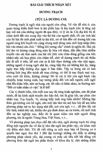 Nhân những dịp tôi tiếp xúc với các bạn thức giả, được thấy đa số ngỏ ý kiến là muốn tôi viết tách riêng ra về Dương trạch thấu giải để có đủ các điều huyền bí dị kỳ của môn ấy, để cho phần đa số người tiện dụng hơn. Bởi lẽ là: Dương trạch thì hết thẩy các giới; giàu, nghèo, ai ai cũng cần thiết dùng đến nó, có thể tự thực hiện làm được, chứ cả toàn khoa địa lý phong thủy về âm phần thì cao siêu khó hiểu chỉ dành cho những người có khả năng và trí lực, tài lực đủ phương tiện mới theo nỗi, còn phần nhiều là những người chỉ cần biết một phần về dương trạch, mà phải mua cả một bộ sách địa lý về âm phần thì có điều hơi phiền phức. Vậy tôi cũng thể theo ý của phần đa số đại chúng, nên không dám bạo gan. Tuy tuổi già, sức yếu, cũng ráng cố sưu tầm về phần dương trạch của tiên hiền, tiên triết đã phát minh, nay soạn tỏ ra theo thứ tự như dưới đây để các độc giả cùng nghiên cứu, cùng kinh nghiệm, xem xét cả ngôi nhà về dĩ vãng và hiện tại, để tránh cái dữ, lựa chọn cái lành, mà kiến tạo hay sửa chữa, canh cải lại nhà mình cho hợp lý khí khiến cho gia đình được an cư thịnh vượng. Việt –Hải