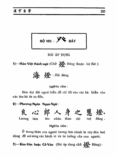 Trong “hán tự tự học” quyển II trình bày các bài áp dụng theo nguyên tắc “Do thiển nhập thâm” bắt đầu từ một hán Việt thành ngữ, thứ đến là một phương ngôn hay ngạn ngữ và sau cùng là bài Kim văn hoặc Cổ văn, trong ấy có chữ thí dụ thuộc về mỗi bộ. Chỉ có phần sau cùng là bài Kim văn hoặc Cổ văn đã chẳng những được phiên âm theo cách đọc Hán Việt mà lại còn chú thích những chữ khó trong bài, là vì các bài Kim văn hay Cổ văn này đã được trích ra ở các loại sách hiếm có. Trái lại, các Hán Việt thành ngữ và các phương ngôn hay ngạn ngữ chỉ được phiên âm theo lối Hán Việt mà thôi. Dụng ý này là cốt để cho các đọc giả nếu muốn học thêm thì dùng một bộ Hán Việt tự điển mà tra thì sẽ thấy thích thú ngay.