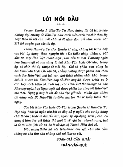 Các bài Kim văn hoặc Cổ văn trong quyển II “hán tự tự học“ này hoặc là ngắn nếu bài có đầy đủ ý nghĩa cho sự áp dụng chữ thí dụ, hoặc là dài nếu bài, ngoài sự áp dụng trên, còn có dụng ý làm đọc giả thích thú một là về giá trị văn chương , hai là về tài liệu lịch sử và ba là về đạo vị Thánh Hiền đời cổ.