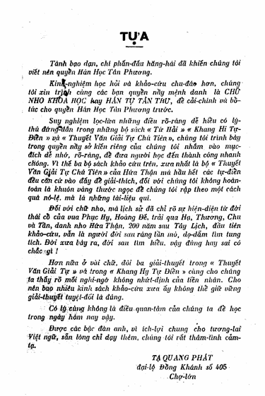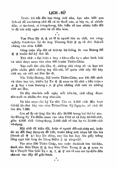 Cuốn “Hán văn giải tự” cung cấp cho quý thầy một cái nhìn tổng quát về cách cấu tạo của chữ Nho. Những bộ để ghép thành, cần – yếu nhất cho quý thầy khi tra cứu, là những tài liệu giúp các bạn theo dõi được việc học chữ nho có ý thức thông thái.