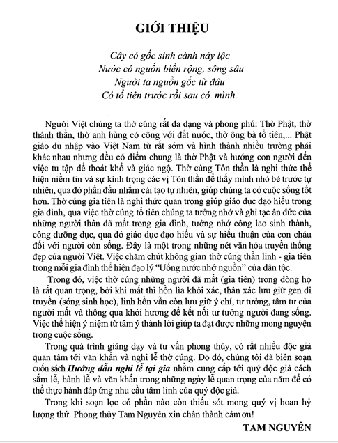 Tác giả biên soạn “Hướng dẫn nghi lễ tại gia” nhằm cung cấp tới quý độc giả cách sắm lễ, hành lễ và văn khấn trong những ngày lễ quan trọng của năm để có thể thực hành đáp ứng nhu câu tâm linh của quý vị, độc giả.