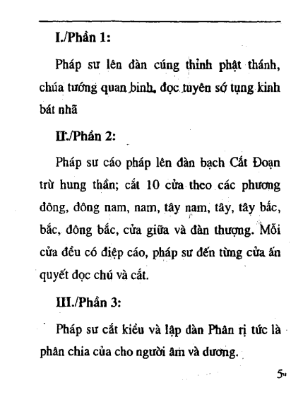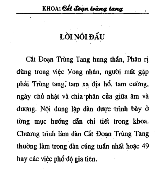 Cuốn khoa cúng cắt đoạn trùng tang dùng trong việc vong nhân, người mất gặp phải trùng tang, tam xa địa hổ, tam cường, ngày chủ nhật và chia phân của giữa âm và dương. Nội dung lập đàn được trình bày ở từng mục hướng dẫn chi tiết trong khoa.