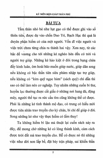 Tấm thân nhỏ bé như hạt gạo có thể được ghi vào sổ thiên tiên, được dự vào chốn Dao Trì, Bạch Hạc thì quả là duyên phận hiếm có của một người. Vốn dĩ việc người và việc trời chưa từng chia ra thành hai vậy. Xưa nay, từ các bậc đế vương cho tới những kẻ nghèo hèn đều có trời và người trợ giúp. Những kẻ hào kiệt ở đời trong bụng chứa đầy kinh luân, ôm hoài bão muốn giúp nước, giúp dân song nếu không có bậc thần tiên siêu phàm nhập tục trợ giúp, nếu không có “kim quỹ ngọc hàm” (sách quý) chỉ dẫn thì sao có thể làm nên cơ nghiệp. Tuy nhiên những cuốn bí thư, huyền lục thường được cất giấu ở những nơi hang đá, động mây, người thế tục ra sức cầu tìm cũng không thể có được.Phải là những kẻ tinh thành mộ đạo, có trung có hiếu mới được tiên nhân trao truyền cho kỳ chân, bí chỉ để giúp ở đời. Song những kẻ như vậy thực hiếm có lắm thay! Ta không hiềm bỉ lậu mà thuật lại cuốn sách này ra đây, để mong chờ những kẻ có lòng thành kính, cảm cách được trời đất mà trao truyền cho. Hễ có được nó thì những việc như dời non lấp bể, đặt bày trận pháp, sai khiến thần linh, biến hóa huyễn ảo, dụng binh như thần chỉ nằm trong lòng bàn tay thôi vậy!