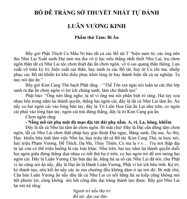 – Bồ đề tràng sở thuyết nhất tự đảnh luân vương. Phẩm thứ Sáu: Phân biệt tướng Bí mật, trang 265.
