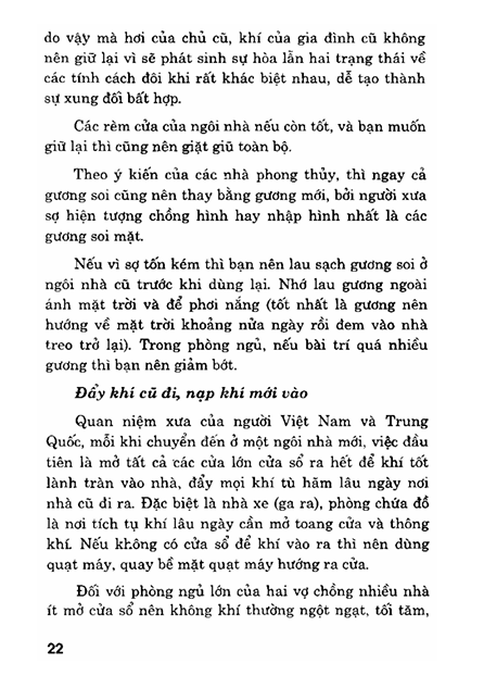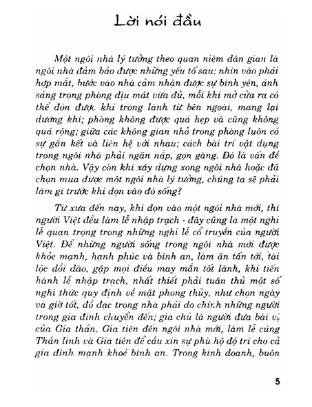 Hy vọng cuốn sách này sẽ giúp quý bạn có thêm nhiều kinh nghiệm bổ ích khi thực hiện những việc cần làm trước khi chuyển vào nhà mới, cách thực hiện nghi lễ nhập trạch, khai trương cửa hàng, văn phòng, công ty… nhằm hướng tới sự thịnh vượng cát tường và an lành cho gia chủ.
