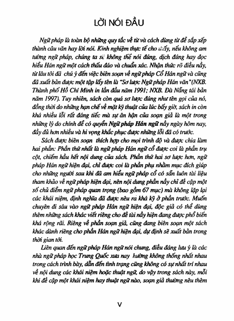 Ngữ pháp là toàn bộ những quy tắc về từ và cách dùng từ để sắp xếp thành câu văn hay lời nói. Kinh nghiệm thực tế cho ủi ấy, nếu không am tường ngữ pháp, chúng ta se không thể nói đúng, dịch đúng hay đọc hiểu Hán ngữ một cách thấu đáo và chuẩn xác. Nhận thức rõ điều này, từ lâu tôi đã chú ý đến việc biên soạn về ngữ pháp Cổ Hán ngữ và cũng đã xuất bản được một tập lấy tên là “Sơ lược Ngữ pháp Hán văn”(NXB. Thành phố Hồ Chí Minh in lần đầu năm 1991; NXB. Đà Nẵng tái bản năm 1997). Tuy nhiên, sách còn quá sơ lược đúng như tên gọi của nó, đồng thời do những hạn chế về mặt kỹ thuật của lúc bấy giờ, sách in còn khá nhiều lỗi rất đáng tiếc mà sự ân hận của soạn giả là một trong những lý do chính để có quyển Ngữ pháp Hán ngữ này ngày hôm nay, đầy đủ hơn nhiều và hi vọng khắc phục được những lỗi đã có trước.