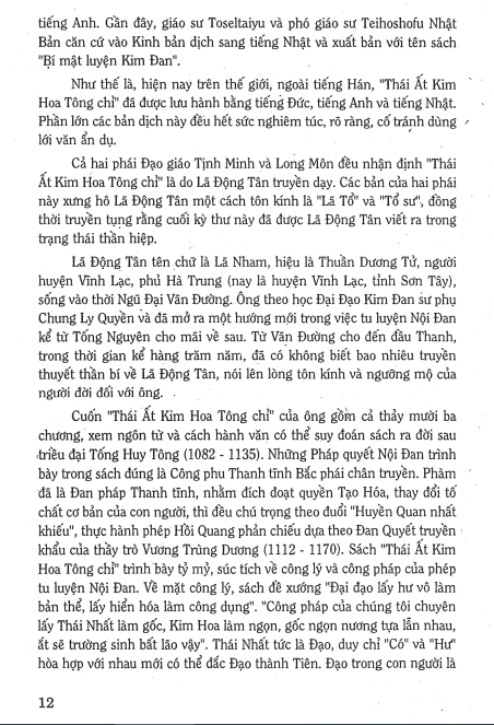 Cuốn Thái Ất Kim Hoa Tông Chỉ của ông gồm cả thảy mười ba chương , xem ngôn từ và cách hành văn có thể suy đoán sách ra đời sau triều đại Tống Huy Tôn (1082 – 1135). Nhưng Pháp quyết Nội Ðan trình bày trong sách đúng là công phu thanh tĩnh Bắc phái chân truyền. Phàm đã là Ðan pháp Thanh tĩnh, nhằm đích đoạt quyền Tạo Hóa, thay đổi tố chất cơ bản của con người ; thì đều chú trọng theo đuổi “Huyền Quan nhất khiếu” thực hành phép Hồi Quan phản chiếu dựa theo Ðan Quyết truyền khẩu của thầy trò Vương Trùng Dương (1112-1170).