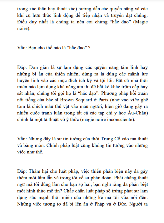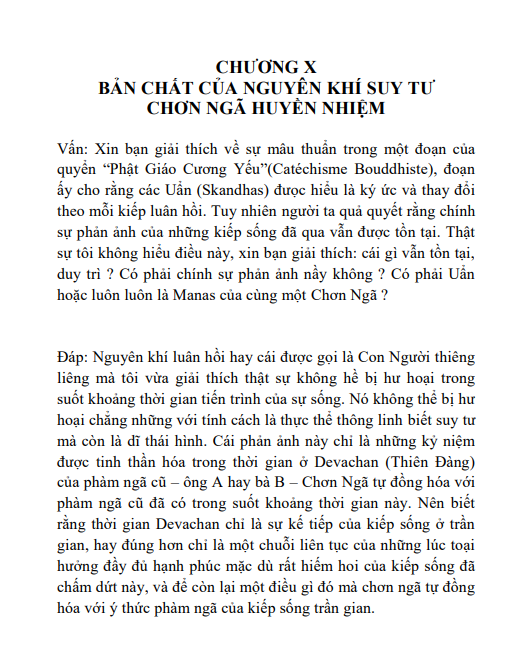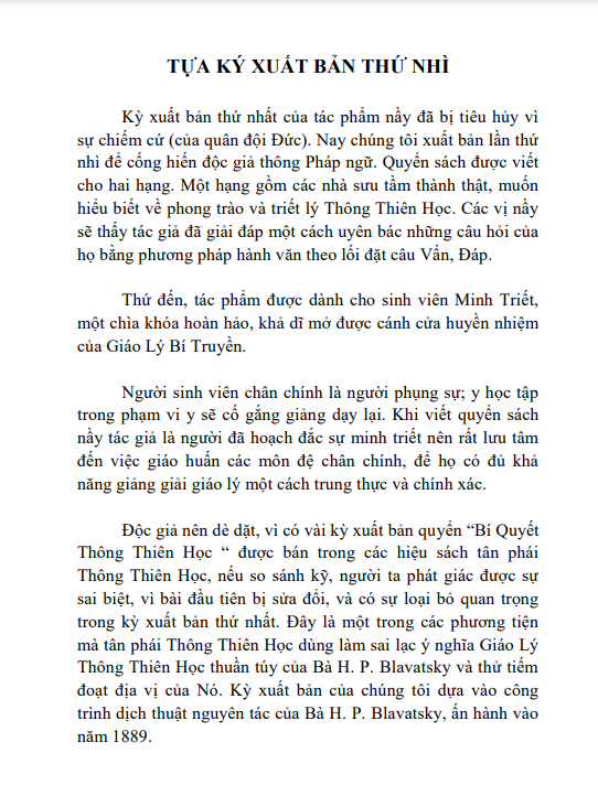 Kỳ xuất bản thứ nhất của tác phẩm nầy đã bị tiêu hủy vì sự chiếm cứ (của quân đội Đức). Nay chúng tôi xuất bản lần thứ nhì để cống hiến độïc giả thông Pháp ngữ. Quyển sách được viết cho hai hạng. Một hạng gồm các nhà sưu tầm thành thật, muốn hiểu biết về phong trào và triết lý Thông Thiên Học. Các vị nầy sẽ thấy tác giả đã giải đáp một cách uyên bác những câu hỏi của họ bằng phương pháp hành văn theo lối đặt câu Vấn, Đáp.
