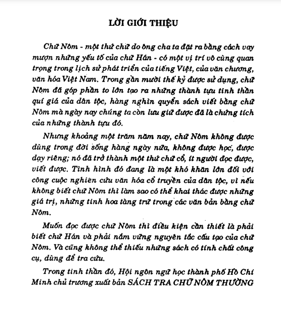 Vui mừng giới thiệu SÁCH TRA CHỮ NÔM THƯỜNG DÙNG với quý độc giả, Hội ngôn ngữ học thành phố Hồ Chí Minh tin rằng quyển sách sẽ có ích cho công việc tìm hiểu những vấn đề thuộc lĩnh vực Hán – Nôm ở nước ta, những vấn đề hiện đang được đặt ra một cách nghiêm chỉnh.