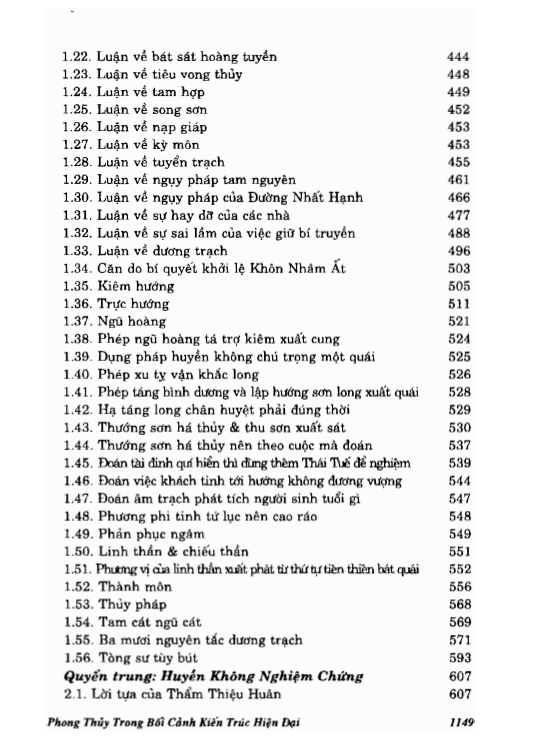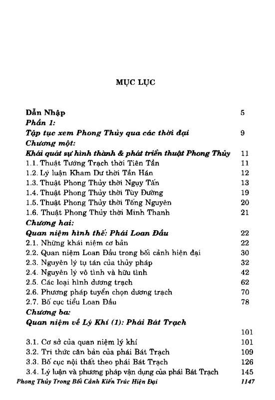 Phần 1: là phần biên soạn trình bày khái quát về thuật Phong Thủy trong bối cảnh kiến trúc hiện đại, gồm 4 chương như sau:Chương 1: Khái quát sự hình thành và phát triển thuật Phong Thủy.Chương 2: Quan niệm Hình Thế: phái Loan Đầu.Chương 3: Quan niệm về Lý Khí (1): phái Bát Trạch.Chương 4: Quan niệm về Lý Khí (2): phái Huyền Không.