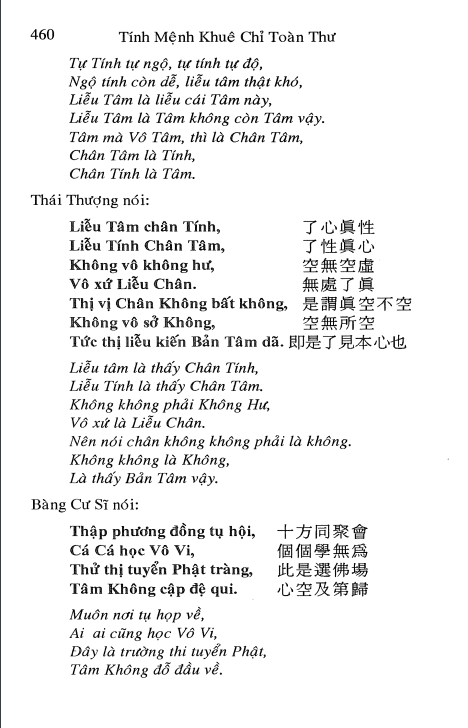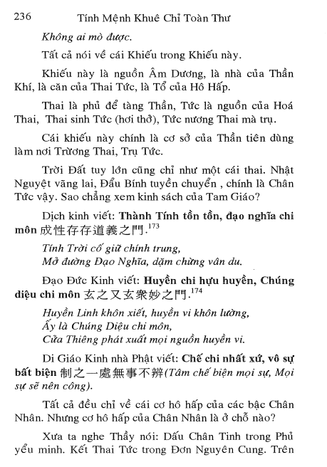 Tính Mệnh Khuê Chỉ dạy ta không biết bao nhiêu là khẩu quyết, không biết bao nhiêu bài thơ. Chung qui vẫn dạy chữ Nhất. Phục Hi Văn Vương được chữ Nhất mà Chu Dịch hưng khởi. Đại Võ, Cơ Tử được chữ Nhất, mà Hồng Phạm Cửu Trù sinh; Chu Mậu Thúc (Chu Liêm Khê) được chữ Nhất mà có Thái Cực Đồ; Thiệu Nghiêu Phu (Thiệu Khang Tiết) đắc Nhất mà viết Hoàng Cực Kinh Thế; Lão Tử được chữ Nhất, mà vạn sự tất; Thích Ca được chữ Nhất mà Vạn Pháp qui. Qui Căn là Qui Nhất, Phục Mệnh là Phục Nhất vậy. Và dạy tìm Nê Hoàn Cung