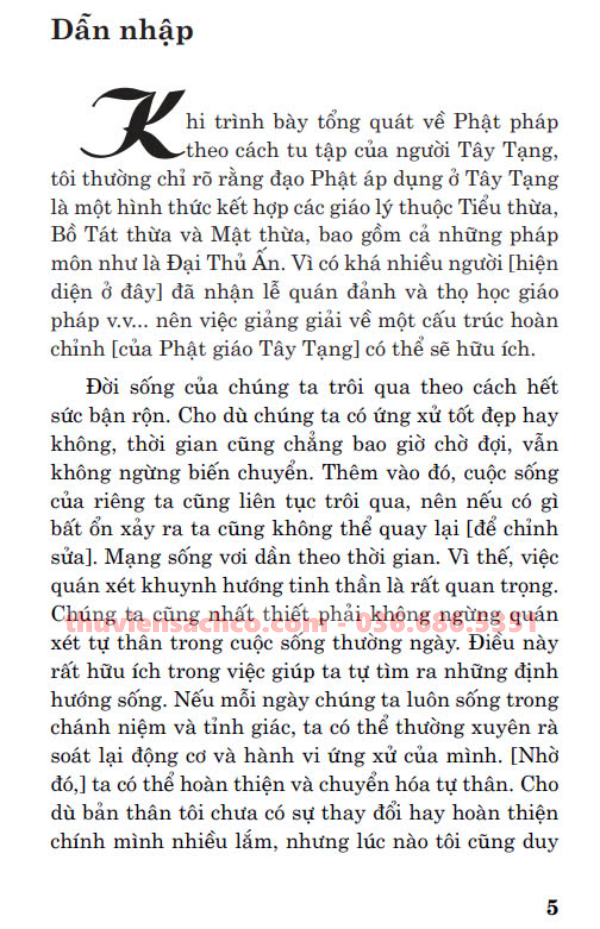 Khi trình bày tổng quát về Phật pháp theo cách tu tập của người Tây Tạng, tôi thường chỉ rõ rằng đạo Phật áp dụng ở Tây Tạng là một hình thức kết hợp các giáo lý thuộc Tiểu thừa, Bồ Tát thừa và Mật thừa, bao gồm cả những pháp môn như là Đại Thủ Ấn. Vì có khá nhiều người [hiện diện ở đây] đã nhận lễ quán đảnh và thọ học giáo pháp v.v… nên việc giảng giải về một cấu trúc hoàn chỉnh [của Phật giáo Tây Tạng] có thể sẽ hữu ích.