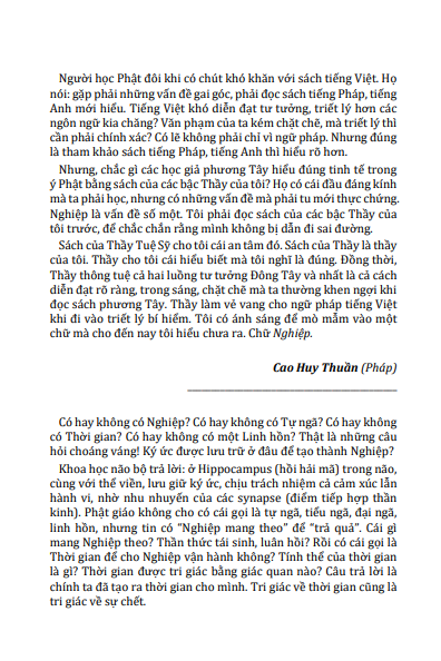 “Có quá nhiều thuật ngữ triết học, tôn giáo nói chung và Phật giáo nói riêng trong các ngoại ngữ như Anh, Pháp, Đức, Phạn, Hán… đã được chuyển ngữ sang tiếng Việt một cách đượm nghĩa và tài hoa. | Trần Kiêm Đoàn (Hoa Kỳ). ___ Và từ góc nhìn văn học, người ta có thể đọc tác phẩm này như đọc một du ký sử truyện, qua đó, Nghiệp, một chữ thật ngắn gọn đơn giản nhưng là cả một lộ đồ chỉ nam, đưa chân những Thiện Tài đồng tử đi đến tận những góc bể chân trời, cầu học với những đạo sĩ, triết gia, hiền giả, khoa học gia, bồ-tát…” – Vĩnh Hảo (California).