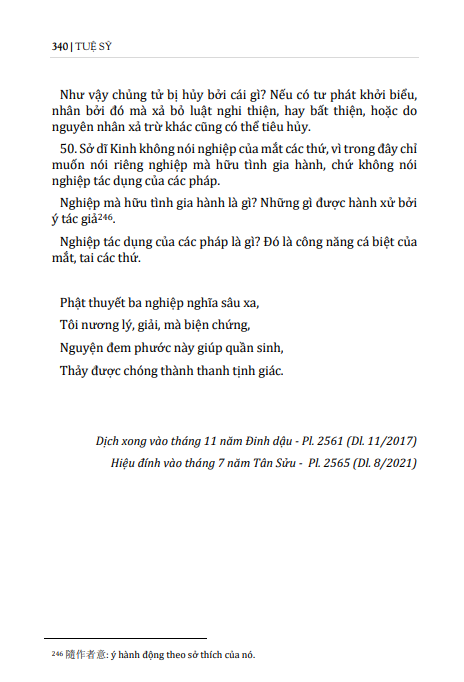“Tác giả viết ngay từ chương đầu: “Từ karma nay đã trở thành một danh từ thời thượng trong thế giới phương Tây”. Vâng, đúng vậy! Nhưng vấn đề này không chỉ ở phương Tây mà cũng là một nan đề cả ở phương Đông. Khó có ai có cái nhìn sâu sắc và đầy đủ về Nghiệp như Hòa Thượng Tuệ Sỹ. Hòa Thượng đã dẫn độc giả đi từ những lý luận chặt chẽ của triết học Tây phương đến tận cùng ngõ ngách của các nền triết học, đạo học Ấn Độ Giáo – nơi mà người ta từng nói đến chữ karma trước khi đức Phật Thích Ca thị hiện. Rồi sau đó bước nhẹ nhàng vào giáo nghĩa Phật Giáo các bộ phái, Nghiệp Luận A-Tì-Đạt-Ma.” – HT. Thích Như Điển (Đức quốc), Chánh thư ký Hội Đồng Hoằng Pháp.