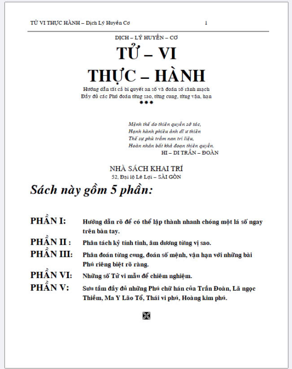 Sách Tử vi thực hành dịch lý huyền cơ này nhằm giúp cho các bạn thích khảo cứu có thể tự mình an số và luận đoán lấy, hầu thoát ra khỏi vòng mê tín hão huyền mà hạng vô lương thường đem ra để lừa bịp người đời.