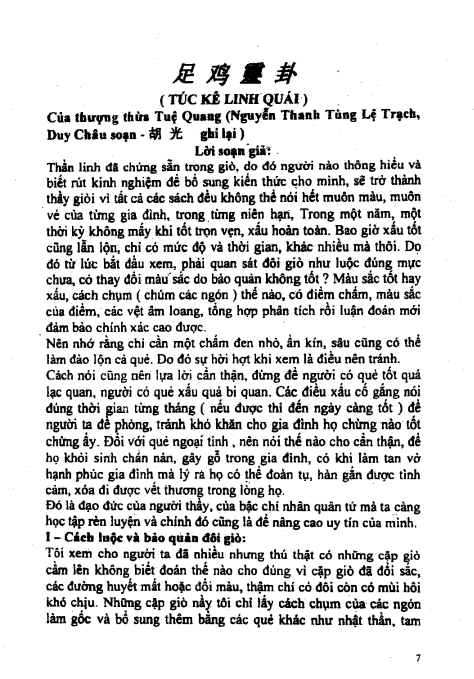 Sách Túc Kê Linh Quái là sách hướng dẫn coi tướng gà chiến. Cuốn sách giúp bạn xem vẩy chân, đầu mặt của chú gà chọi từ lúc mới bóc trứng chuẩn nhất. Bạn sẽ chọn cho mình được những chiến kê xuất sắc.