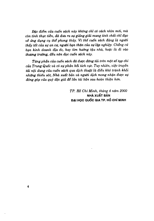 Vì thế cuốn sách này đáng là người thầy tốt của sự an cư, người bạn của sự lập nghiệp. Chẳng cứ bạn là nhà kinh doanh địa ốc, hay tìm hướng tậu nhà, hoặc là đi vào thương trường, đều nên đọc cuốn sách này.