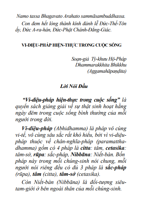 Vi-diệu-pháp (Abhidhamma) là pháp vô cùng vi-tế, vô cùng sâu sắc rất khó hiểu, bởi vì vi-diệupháp thuộc về chân-nghĩa-pháp (paramattha- dhamma) gồm có 4 pháp là citta: tâm, cetasika: tâm-sở, rūpa: sắc-pháp, Nibbāna: Niết-bàn. Bốn pháp này trong mỗi chúng-sinh nói chung, mỗi người nói riêng đều có đủ 3 pháp là sắc-pháp (rūpa), tâm (citta), tâm-sở (cetasika).